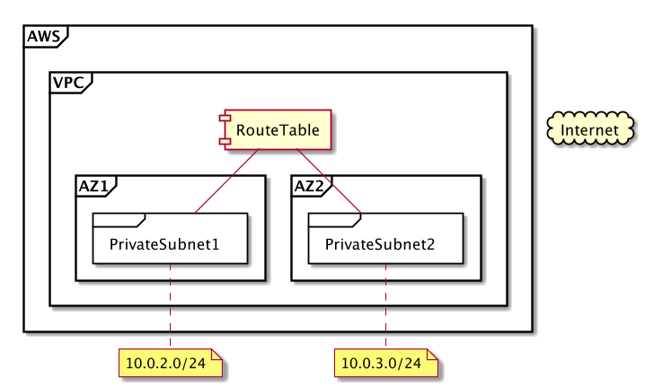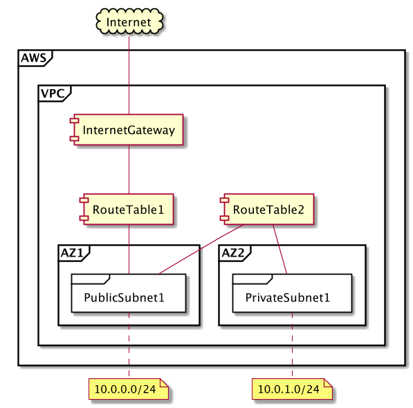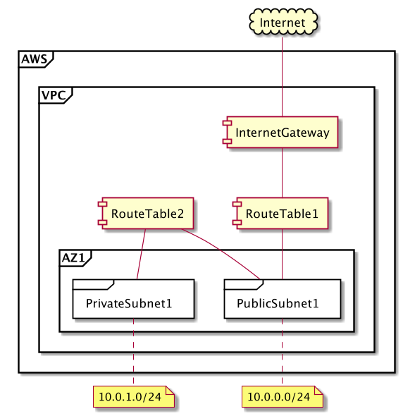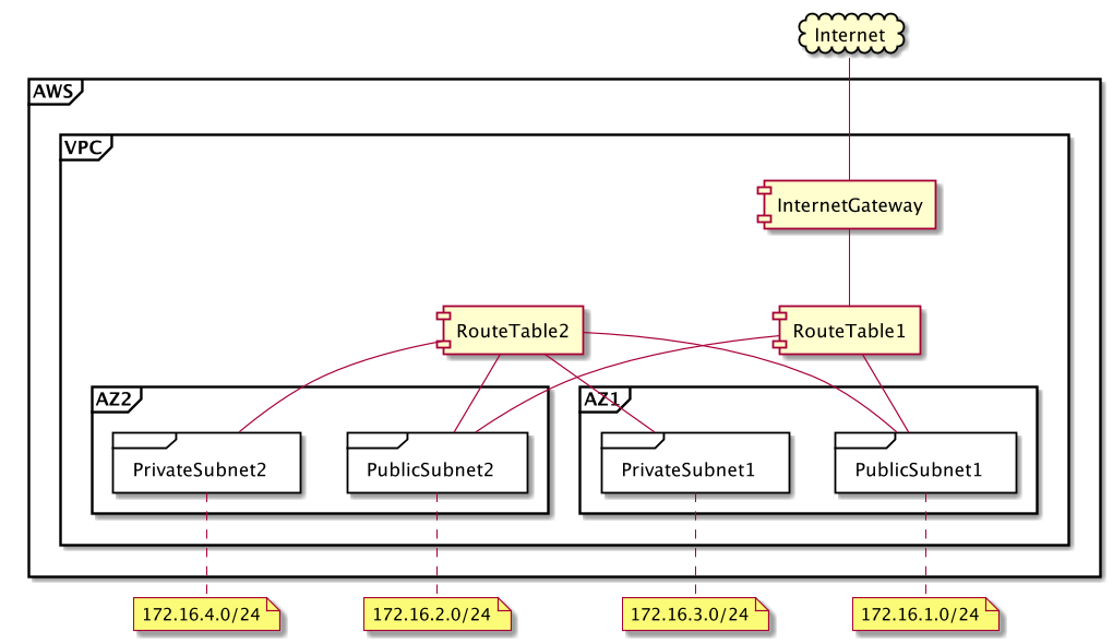 - 1つのアベイラビリティゾーンに1つのパブリックサブネットと1つのプライベートサブネット