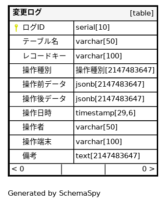 | ログID | serial | 10 | √ | nextval('"変更ログ_ログID_seq"'::regclass) |