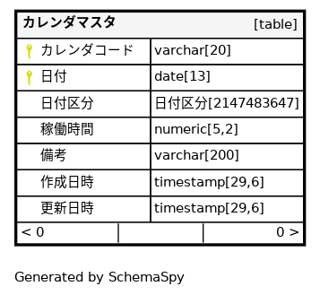 | カレンダマスタ_pkey | Primary key | Asc/Asc | カレンダコード + 日付 |